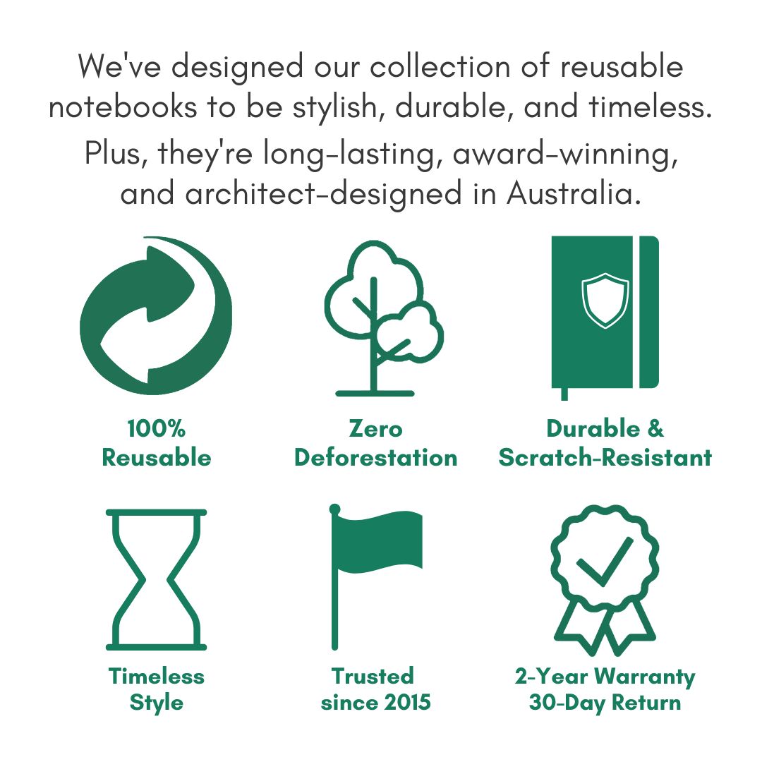 Durable and water-resistant like our refillable notebooks, equip yourself with the tools to capture your ideas and let them flourish.