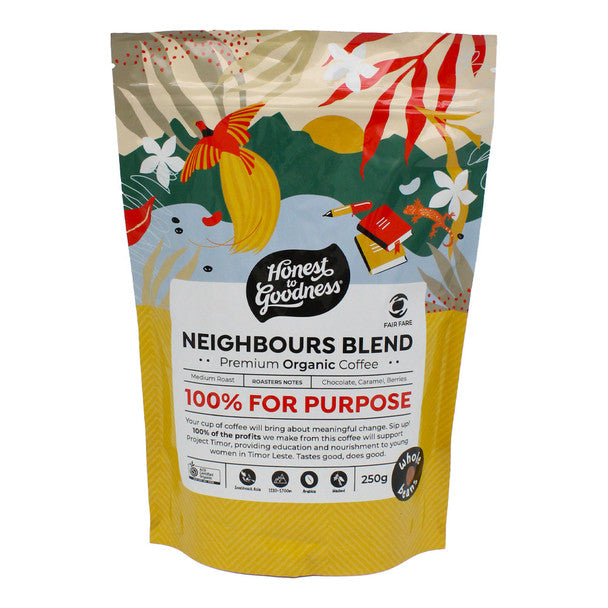 The gift of great tasting coffee from Honest to Goodness' Organic Neighbours Blend Coffee Beans will also help the local community in Timor Leste from where it has been ethically sourced and locally roasted. It's the coffee that gives back!